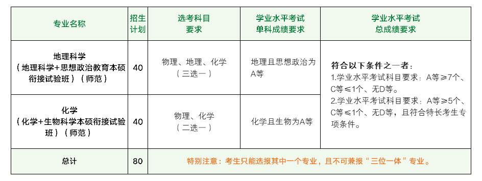 学校招生工作专家委员会对考生资格进行审核,其中1类考生按照学考换算总成绩[A等计10分,B等计8分,C等计4分(新高考之前的往届生学业水平考试C等不计分),其余不计分]从高到低排序,以专业计划数5倍的比例确定获得面试资格的名单。当存在同分考生时,报考“地理科学(地理科学+思想政治教育本硕衔接试验班)(师范)”专业的考生按照语文、数学、外语、历史、物理、化学、生物、技术单科学考成绩高低排序,报考“化学(化学+生物科学本硕衔接试验班)(师范)”专业的考生按数学、语文、外语、物理、技术、历史、地理、思想政治单科学考成绩高低排序。若排序仍相同,则最后一名同分同排名考生均入围。如报名人数不足招生计划数的5倍则全部考生入围综合素质测试环节。