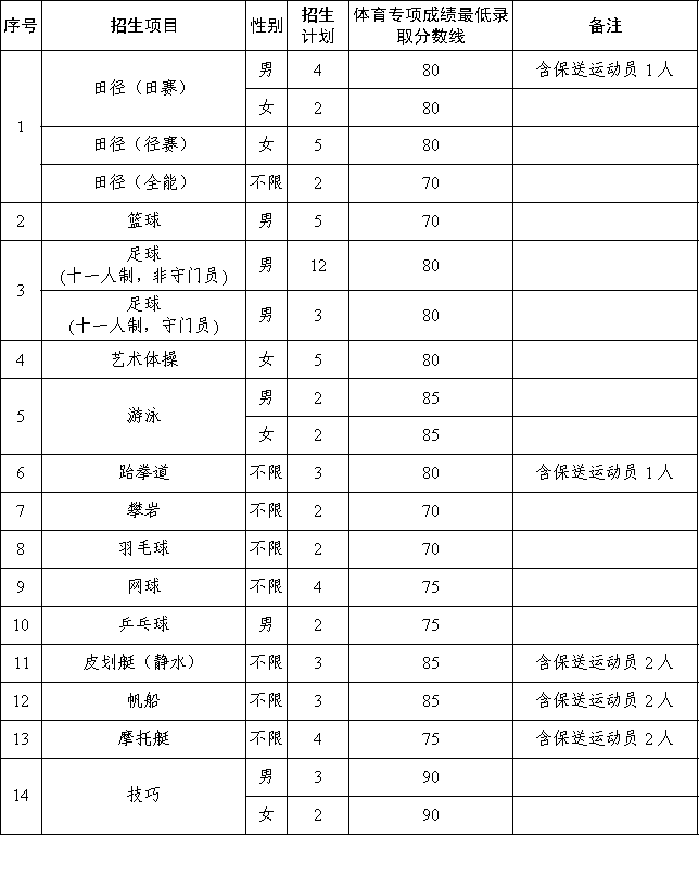 2026年我校运动训练专业分14个项目招生,总计划为70人(含保送),具体项目和招生计划人数如下:
